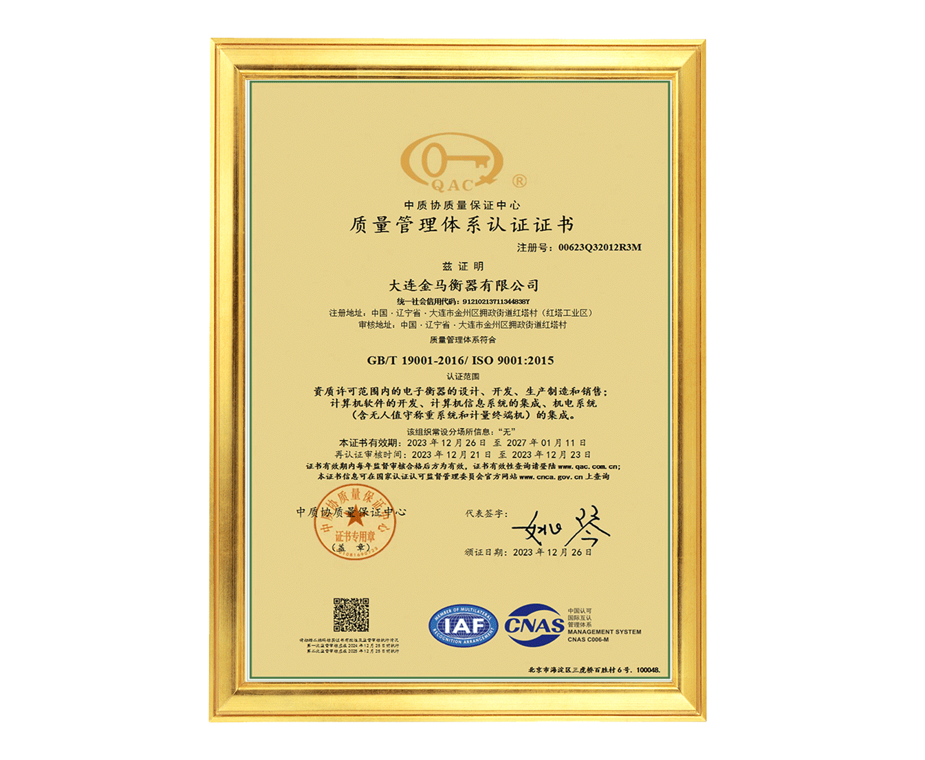 質量管理體系認證證書